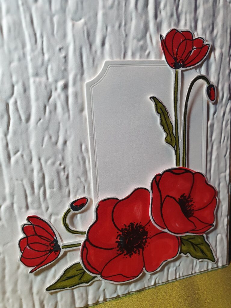De kaart die ik gemaakt heb voor vandaag heb ik vrij eenvoudig gehouden. Het is een basiskaart van Extra Stevig Basic White, met daarop een paneel van Basic White wat ik met de Bark 3D embossingfolder structuur heb gegeven. Daarop zit – ook weer in Basic White – een label wat ik uitgestanst heb met de Painted Label Dies. De klaprozen komen allemaal uit de Painted Poppies stempelset. Deze heb ik met zwarte Memento inkt gestempeld op Basic White kaartkarton en daarna met Stampin’Blends Markers in de kleuren Poppy Parade en Old Olive ingekleurd. Ik kon voor de grote bloemen en blaadjes de stansen uit Painted Label Dies gebruiken, maar ik was al bezig met knippen en dus heb ik alles maar uitgeknipt.
