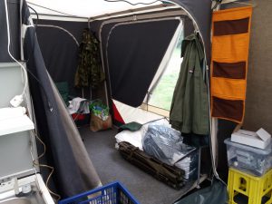 De voortent waar ’s nachts een veldbed voor Priscilla staat wat we met een laken wat afscheiden zodat ze een soort van eigen kamertje heeft: